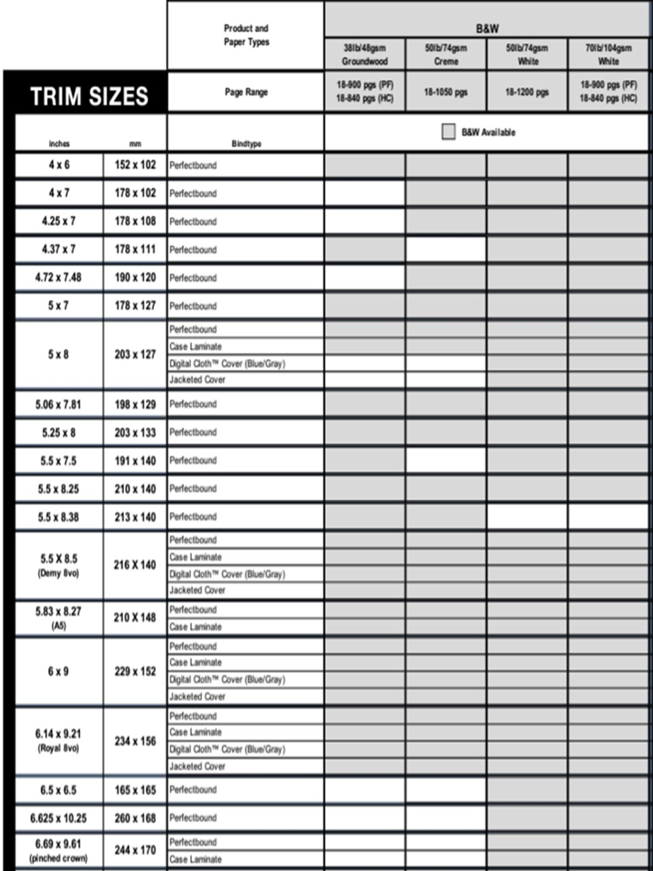 See the charts below for the trim sizes, bindings, and paper options we offer for the books we print. We also offer printing on the inside of the cover and perforated pages for some of the paperback books we print.