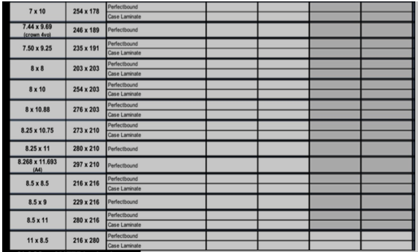 If the field in the 3rd, 4th, or 5th column is gray, that paper is available for the trim size and binding listed on the left side of the chart.