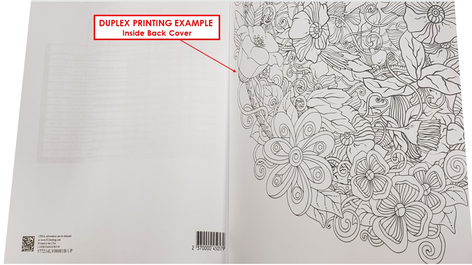 Duplex printing allows the printing of a sheet of paper on both sides. In the case of a book cover, this allows you to design elements to be printed inside the front and back cover. Contact Support to request a sample book.