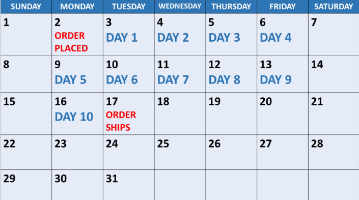 Below is a calendar showing how to calculate when your order will ship based on a 10-day print service level. Print service levels are estimates and may be shorter or longer than this example.