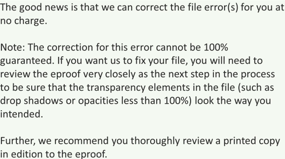 If the files pass the Content Upload Validation process, but the Lightning Source premedia team finds a problem with the file(s) you will be notified by email of the corrections to be made.