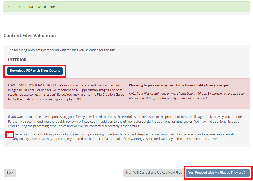 If Lightning Source is not able to correct the file, for example where fonts are not embedded, you will not see any messaging offering the free correction service. Instead, you will be asked to replace the file uploaded with your own corrected version.